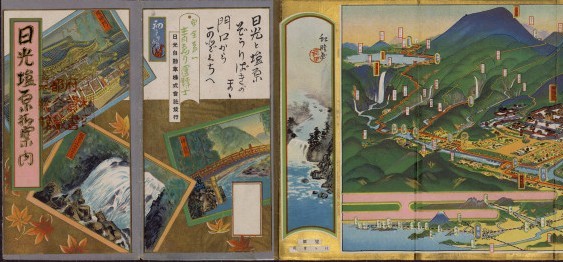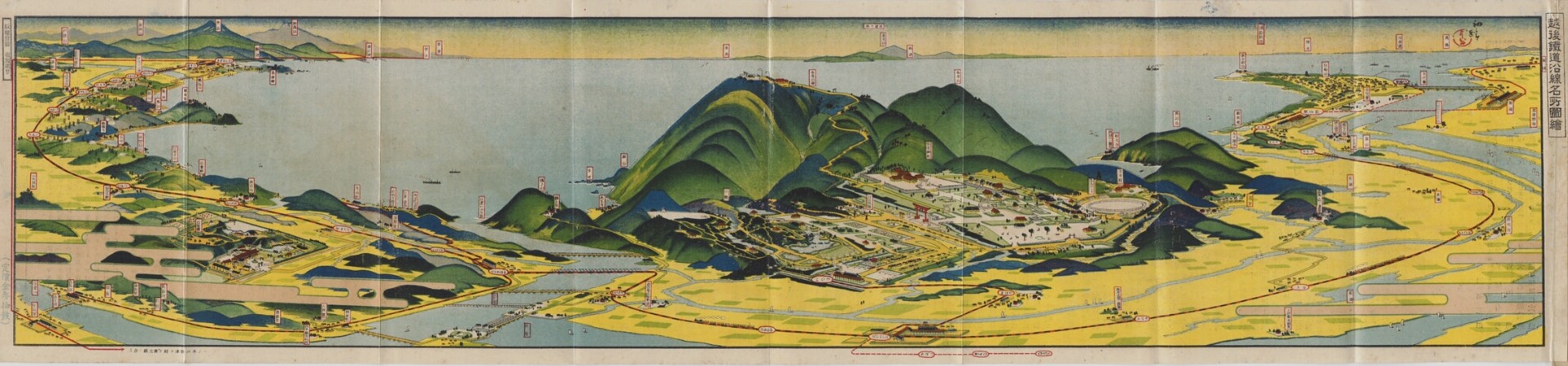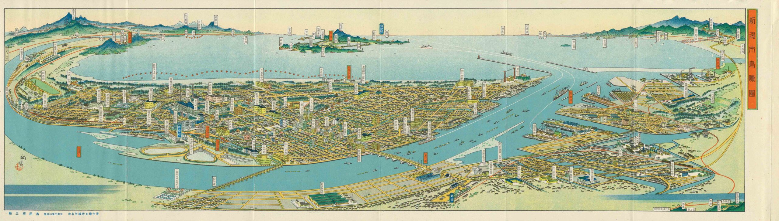 吉田初三郎は「越後鉄道沿線名所図会」を描く取材の折、遠く日本海に浮かぶ佐渡の姿に強く魅せられ、「いつか必ずこの島を描きたい」と胸に刻んだという。念願かなって来島した際、初三郎は島の稜線と湾入の連なり、外海府の荒々しさと国中平野の穏やかさを一望できる“理想の視点”を探し求めた。本図は、その高揚と感動をそのまま鳥瞰構図に凝縮した渾身の作である。相川の鉱山町、両津港、真野湾、佐渡金北山をはじめ、海と山と人の営みが連続する“佐渡の全貌”が、明快な線と色彩で一枚の風景物語として立ち上がる。初三郎の憧憬と探訪の結晶といえる名作である。