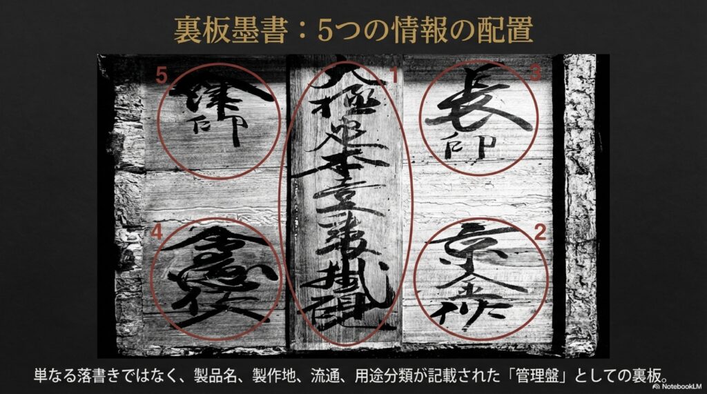裏板の墨書は、中央の主銘と四隅周辺の補助情報により、合計5群の情報配置として捉えられる。これは「誰かの覚書」よりも、むしろ製品名/製作地(製作者)/流通(仕入)/収納分類が書かれた、実務的な“管理墨書”である可能性が高い。