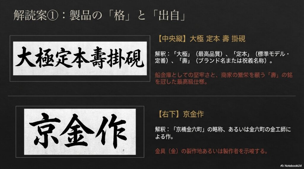 右下の「京金作」は、京橋周辺の金具製作(あるいは装着・誂え)を示す可能性がある。「京=京橋」「金=金具(鉄金具)」「作=制作」を連想させ、箱の価値中核が金具技術にあることを示唆する。