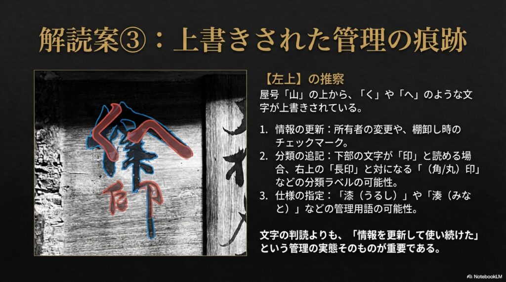 裏板の一部には、屋号「山」の上から「く」や「A」のような字形が重ね書きされた痕跡が見える。ここで重要なのは、文字の“正解”そのものよりも、情報を更新しながら使い続けたという運用実態である。想定できる機能は次の通り。