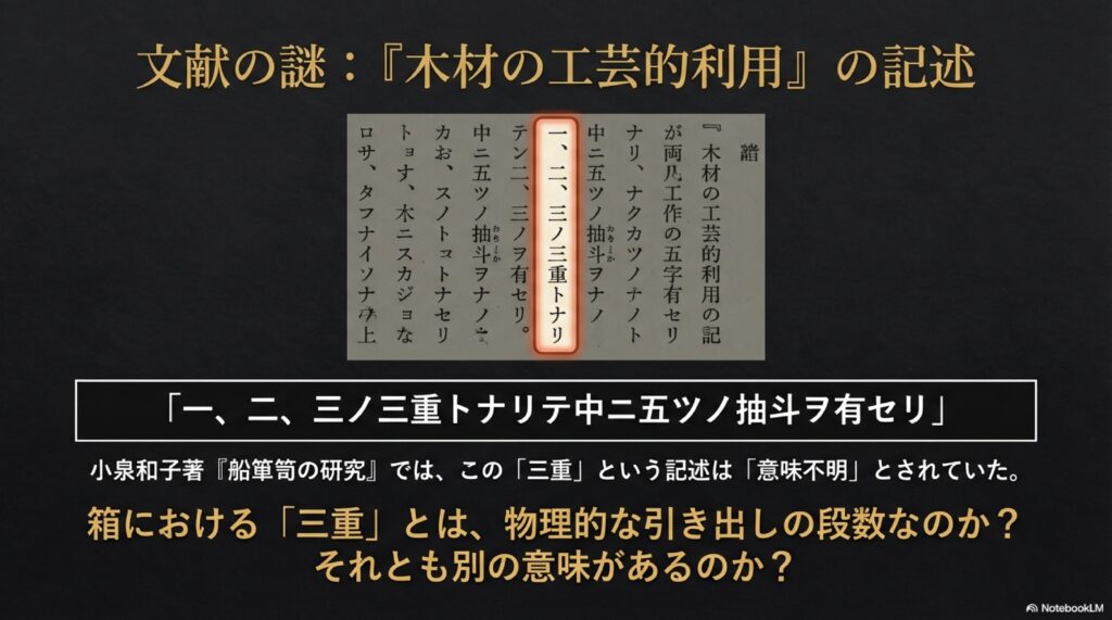 - 文献上の謎であった「三重」は、隠し箱を含む 三段階のセキュリティ構造を指す可能性が高い。