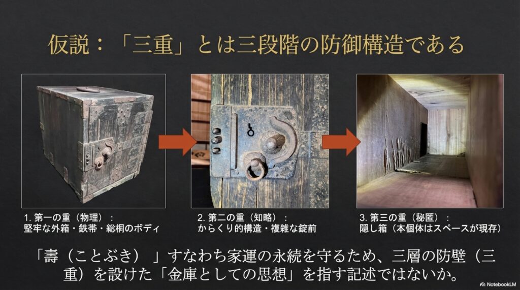 「壽(家運の継続)」を守るために、三層の防壁=**“三重”**を設けた「金庫としての思想」を指す語ではないか、というのが本資料の仮説である。