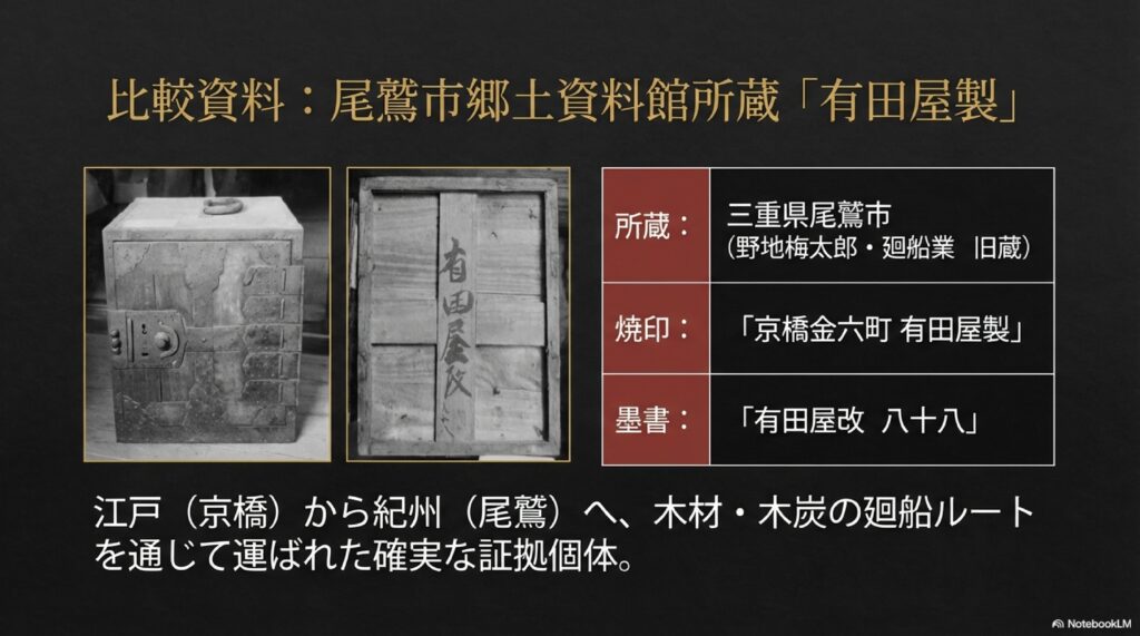 比較対象として、尾鷲市郷土資料館所蔵の「有田屋製」個体が提示される。焼印・墨書情報が明瞭で、江戸(京橋)から紀州(尾鷲)へ、木材・木炭等の海運ルートで運ばれた“証拠個体”として位置づけられる。