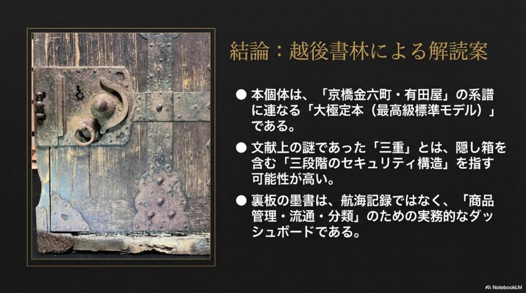 この箱は「船専用の道具」に留まらず、江戸の商業システムと海運ネットワークを結ぶ、水陸両用のハイブリッドとして理解できる。 1.Ink_Code_and_Triple_Security